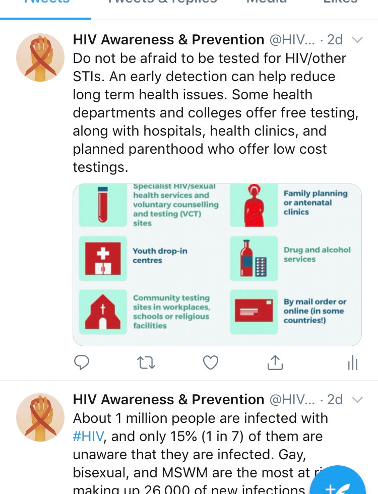 These photos are screenshots from my HIV twitter page. Through this outlet I followed various HIV related accounts and retweeted their tweets regarding general HIV facts and statistics, along with general information like where to find an HIV test location using a test locator. I also generated some tweets of my own, where I made sure to hashtag #HIV whenever I included it in a tweet, as this allows other twitter users to search the hashtag and find my account. I also hash tagged phrases like #NationalHIVTestingWeek , which was a trending hashtag that week and could potentially draw more attention to my account and tweets. I focused my tweets mainly around testing information and infection rates to spread the word and make my followers aware that they are too at risk for contracting HIV even if they don't feel like they are. Also, I made multiple tweets about where to find a testing location because I assumed that high school and even some college aged individuals may not be aware of where to go, or may be too nervous to confront a family member about it and could then hopefully locate one on their own accord.